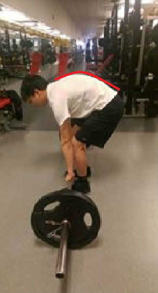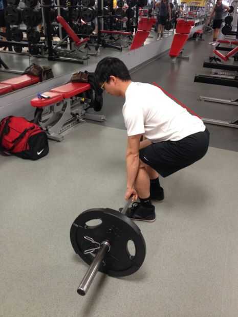 A continuación, está su posición inicial justo antes de levantar el peso. ¿Ver esos grandes espejos allí? Eso es realmente lo que son para. No para gente inútil mirar a sí mismos, o para aquellos de nosotros que no son tan vano a ver cómo enfrentarías bruto miramos todo rojos y sudoroso. Están allí para que usted pueda asegurarse de que su posición es correcta sin el beneficio de un entrenador o un ayudante. Mantener un ojo en su posición con las manos en la barra y los pies ya en el lugar, luego doble las rodillas hasta que tus espinillas toquen la barra. Asegúrese de que la espalda es plana.