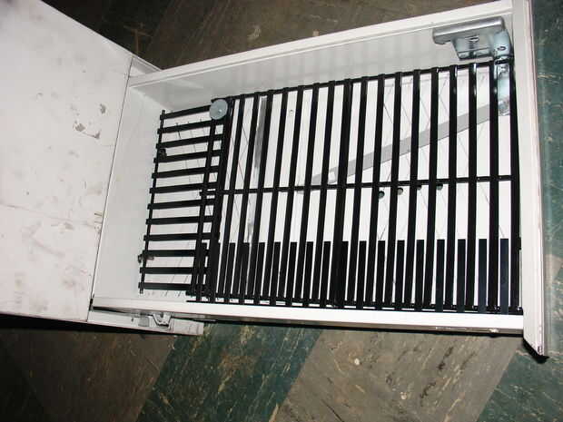 Siguiente configuración de la rejilla del fuego. Esto debe sentarse fuera de la parte inferior que sólo hemos perforado, permitiendo que el regulador deslizar hacia adelante y hacia atrás y permitir que un proyecto de aire por debajo de los carbones de habitación. Para levantar la rejilla, usé unas clavijas de soporte estante