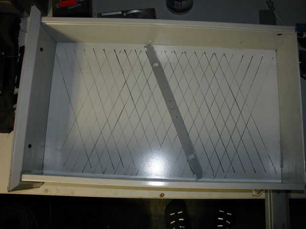 Usando una regla, dibuja una cuadrícula con ~ 1" espacio en la parte inferior del cajón. Pone el divisor en la parte inferior del cajón y configuración una armadura o algo para permitir deslizamiento (hizo uso de la manija del metal y bares también presentes en el divisor y unos remaches para unir las cosas de la cerradura). Marque el ancho del divisor en la parte inferior donde usted la quiere cerrada, luego deslícela hacia la posición abierta y marca otra vez. Perfore un agujero de 1/4" o algo así en varias de las intersecciones (lo hice alrededor de 20) en el área cubierta en la posición cerrada. Perfore unos agujeros en la sección que no está cubierto, sólo para asegurarse de que el fuego es aire (piense de él como el "ralentí" en un acelerador).