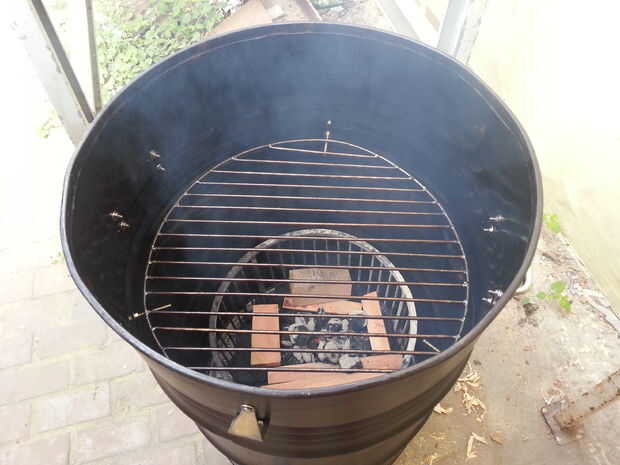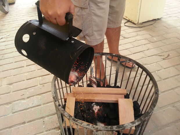 3. iniciar algunos carbón y coloque en el centro de la canasta sobre el resto del carbón y la madera.