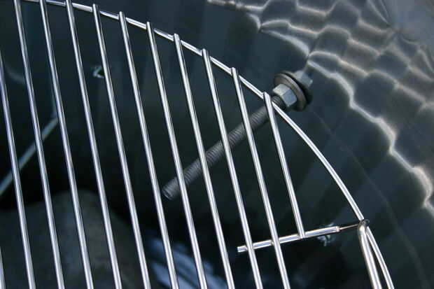 A continuación, necesitará construir soportes para la parrilla. Usando un 3/8" pedacito de taladro, haga tres agujeros aproximadamente 8" por debajo de la parte superior de la basura, que equidistantly se coloca alrededor de la circunferencia de la lata. Luego deslice tres tornillos de 3 "x 3/8" a través de los agujeros y asegure con tuerca y arandela correspondiente. Esto se utilizará para sostener la reja permitiendo la reja que se puede quitar fácilmente.