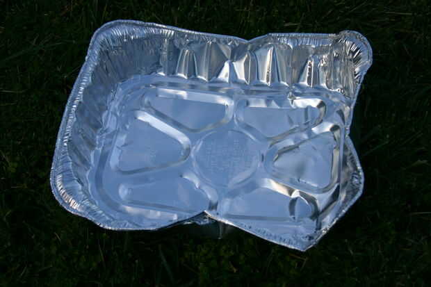 Para un pan, simplemente se utiliza una sartén de Turquía desechables que pliega levemente para caber comodamente en el bote de basura. Desea pan para descansar unos 7" debajo de la reja, pero tener un amplio margen a los lados para el humo al pasar por debajo.