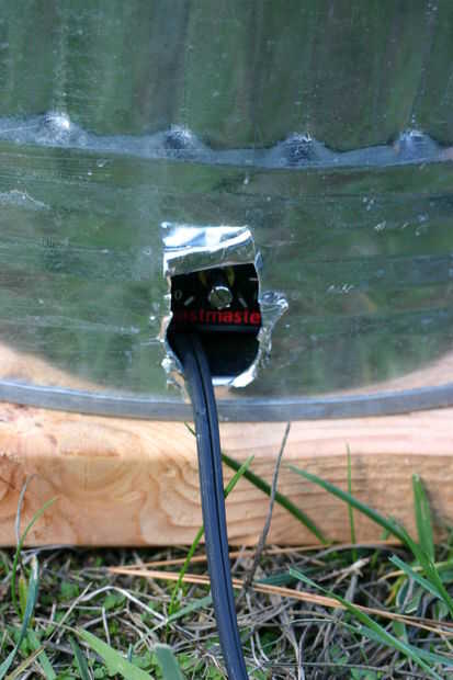 El cable de alimentación a través del orificio en la parte inferior y conéctelo a un cable de extensión adecuado.