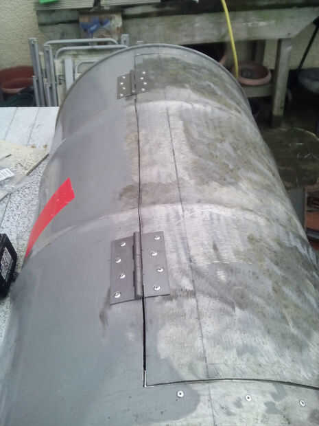 Alinearon las bisagras y centro perforado y dos agujeros perforados en cada bisagra en esquinas opuestas. Comprobación entonces balancea correctamente y ajuste, taladrado y remachado el resto.