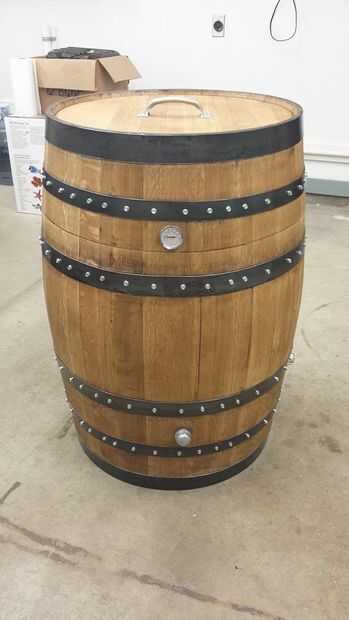 A continuación nos completamente lijar el exterior del cañón hasta que tenía un agradable, suave, incluso exterior. En este punto, si te gusta el aspecto natural puede dejarlo y pasar al siguiente paso. Hemos querido nuestro barril un poco más oscuro había lo había manchado y poner un sellador en él ya que iba a estar fuera de vez en cuando. Sólo utilizamos sellador de cubierta de madera. En este punto, si el barril tiene un agujero de corcho en el lado nuestro igual te querrá saber qué corcho de gran tamaño se necesita para llenar el hueco. También puede hacer un corcho cortando un círculo de un repuesto 2 x 4 que tienes ahí. Sólo asegúrese de que encaje bien. Ponemos silicona alrededor del corcho en el interior del cañón para asegurarse de que es hermética.