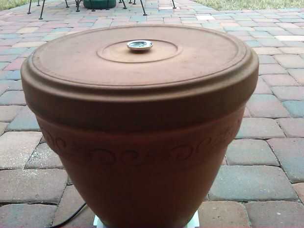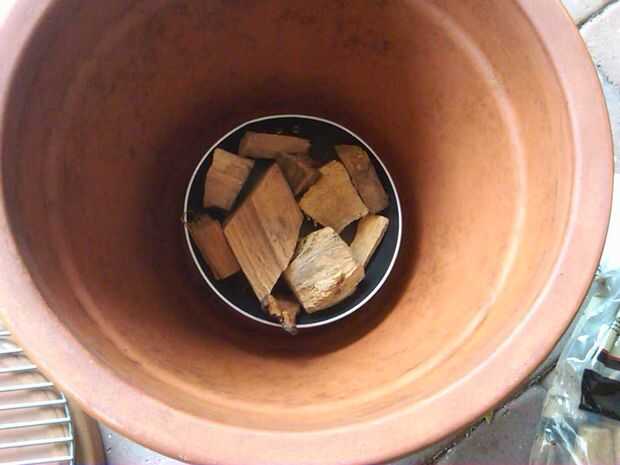 Ahora, ponerlo todo junto. Coloque la bandeja en la parte superior del quemador. Poner trozos de leña sobre la bandeja (trozos grandes duran más). Vestíos de la parrilla. El contorno/curvatura del bote sostenga la parrilla en su lugar. Y finalmente, coloque el termómetro en el orificio creado en la tapa.