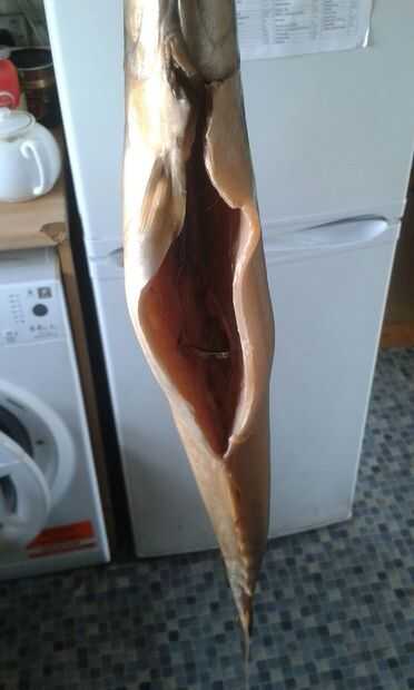Como paso final una vez que los primeros peces fueron quitados después de fumar tuve que cortar el ojo original del pincho sobre dónde sería la última curva para completar el diamante del ojo colgante ahora se ha demostrado el colgante ojo se pasa a través de la boca de los peces desde dentro de la cavidad intestinal antes de enganchar el lazo alrededor de la columna vertebral.