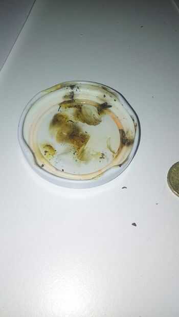 Ahora tenemos el combustible, a continuación queremos hacer llegar la tapa de un frasco (ver la otra foto) que queremos poner el combustible en la jarra para que cuando lo quemamos, queda un resedue marrón. eso es lo que aspiramos.