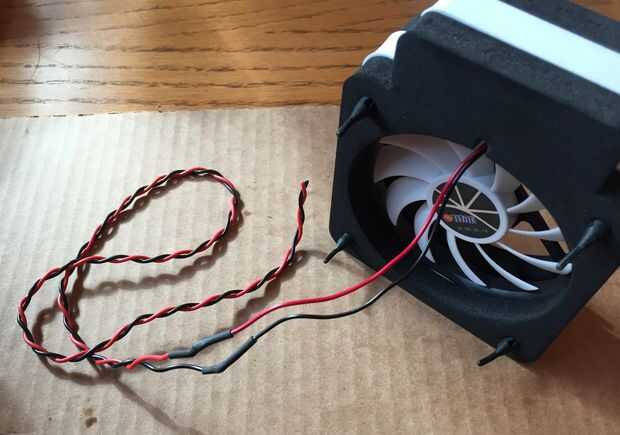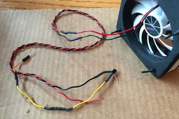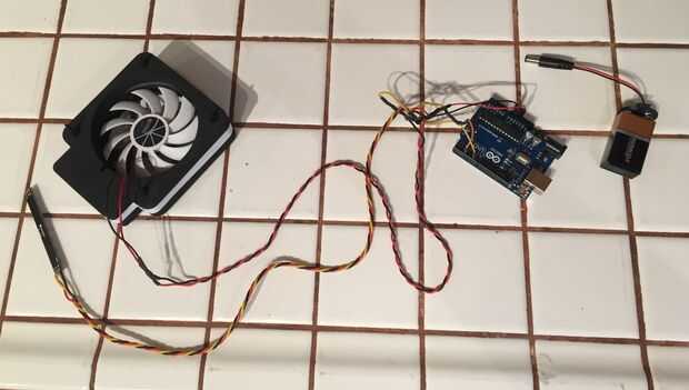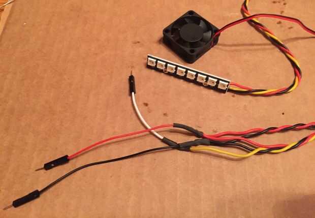 Los LEDs + y Fan + están conectados al pin de 5v de la placa Arduino. El emisor de transistor y tierra de LEDs están conectados con el conector de tierra en el Arduino. La base del transistor está conectada al pin Digital 3 Arduino con un resistor de 270 ohm para reducir el consumo de corriente (las imágenes muestran un 1K ohm, pero 270 es mejor para los fans más pequeños). El LED digital PIN está conectado al pin digital 6 en el Arduino. El colector del transistor se conecta al cable del ventilador.