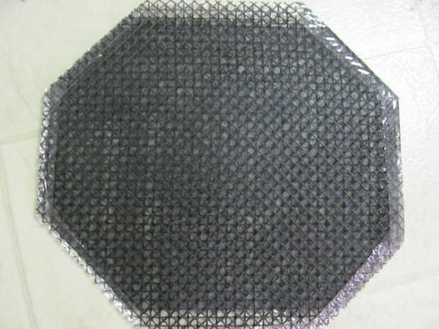 Pone una diagonal sobre la parte superior de la otra para formar un patrón entrecruzado de malla. Cinta o éstos pegan y corte las esquinas extendidas para hacer un octágono de malla. Hacer dos de estos octágonos.