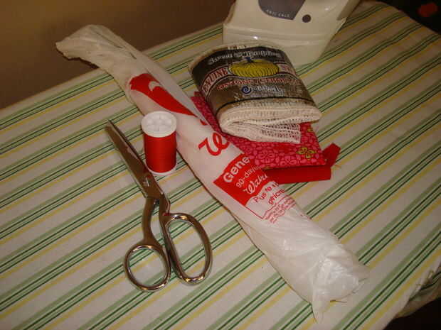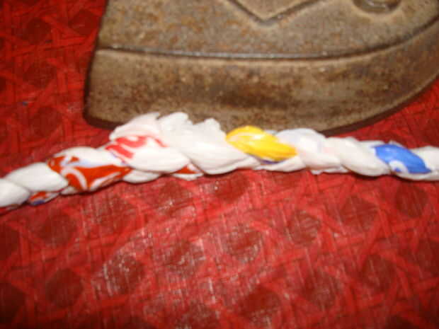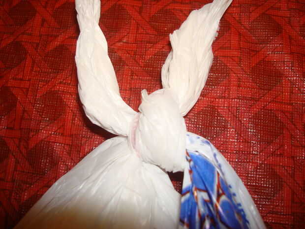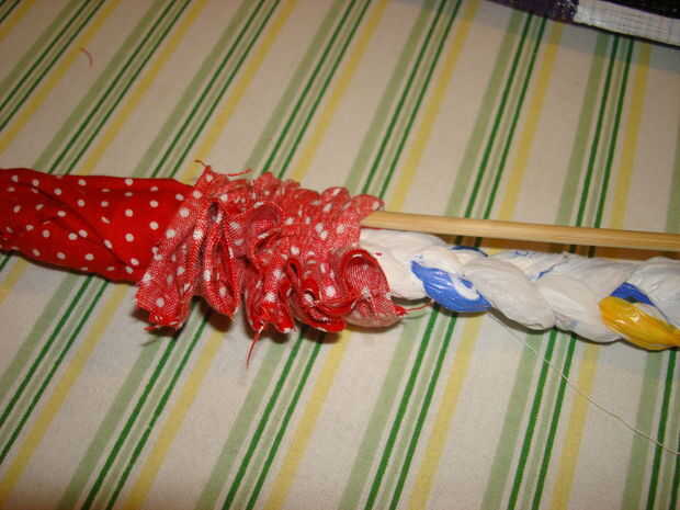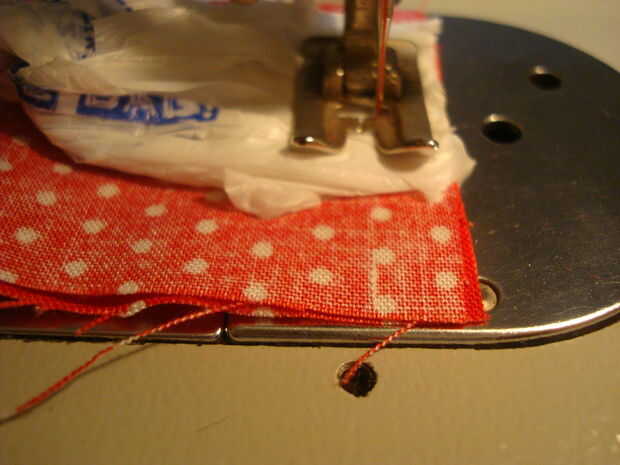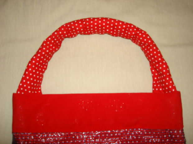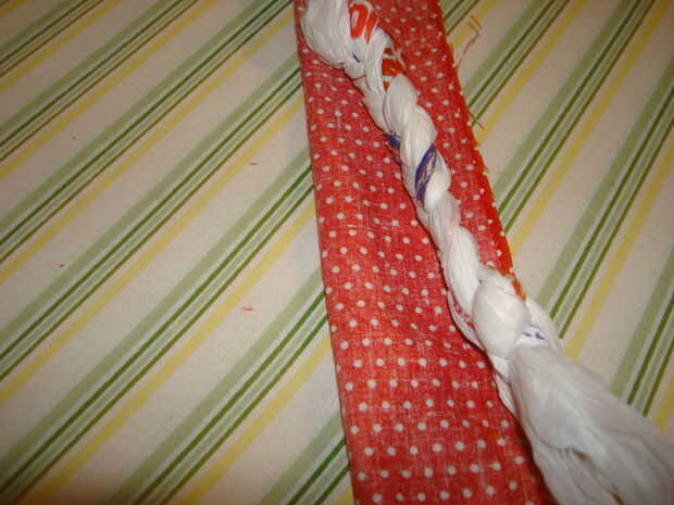 Añadí los márgenes a los lados y agregó un par de pulgadas en la parte superior antes de cortar 4 capas de tela. Trenzado de 3 bolsas de plástico para formar el soporte. Corte una tira de tela doblada para formar una funda de almohada y había cosido el soporte en un extremo. Hice un costura coser un borde ligeramente más grande que el soporte y resultó el lado derecho de la tela. Dio vuelta abajo al final para un aspecto acabado agradable. El mango está cosido en ambos extremos de la bolsa en la parte posterior de las costuras en el interior de la bolsa.