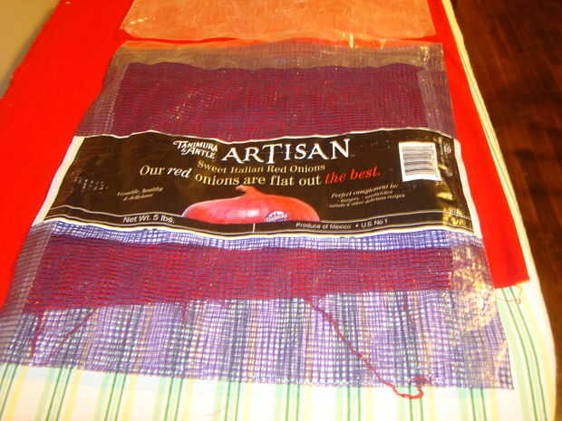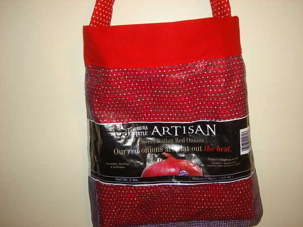 Aquí es un divertido bolso de nion (). Está hecha de bolsas de plástico cebolla de buena calidad y ha sido forrado con tela impresa y sólida. Las manijas son de tela estampada forrada con bolsas de moda. Este exquisito bolso tiene muchos usos. Llene con algún papel bonito, una cinta y añada un regalo. El receptor será encantado y sorprendido con su creatividad. El tamaño es perfecto para un saco de comida. Este bolso es justo lo que necesitas para pequeños proyectos de fabricación que puede trabajar fuera de casa. Un fabuloso bolso de compras.