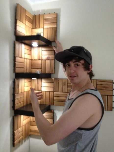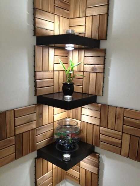 estos estantes son diseñados para montarse en la esquina de una habitación y colgar en las paredes adyacentes dos. Los estantes son trabajos de tipo medio, como son apoyados por cantidades mínimas de hardware oculto para dar la apariencia de ser rea