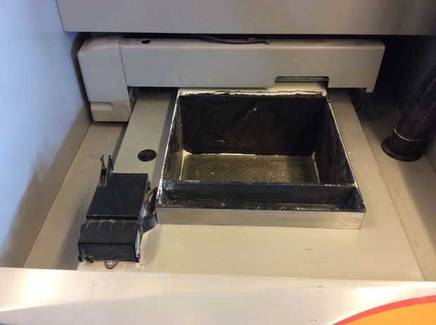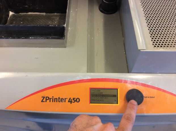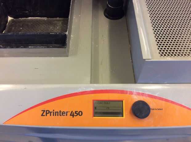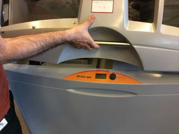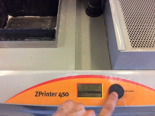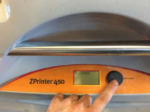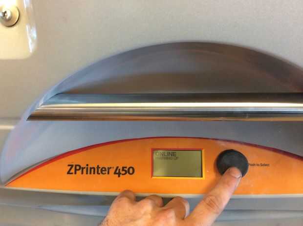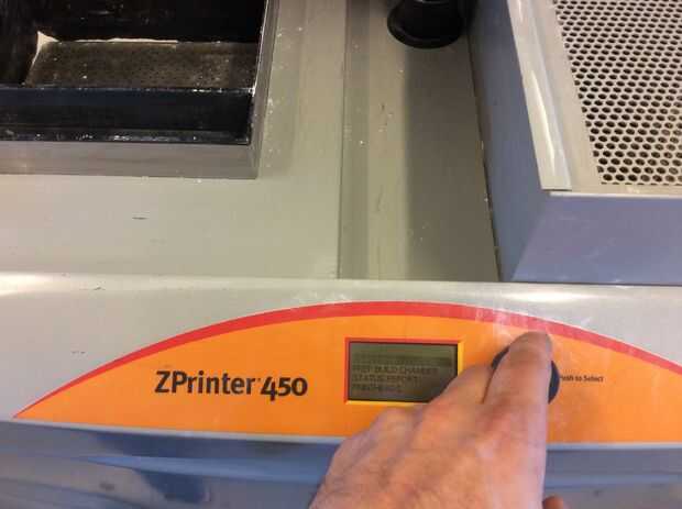 La impresora será probablemente en modo de reposo al llegar primero a él. Haga clic en el botón negro una vez que lo despierta. Ahora debería decir "en línea/calentamiento de arriba". El primero esto tenemos que hacer para preparar la cámara de la construcción. En esta zona plata en el frente de la máquina con los orificios. Esto es donde se realizará la impresión.