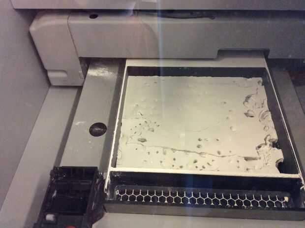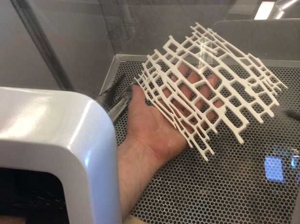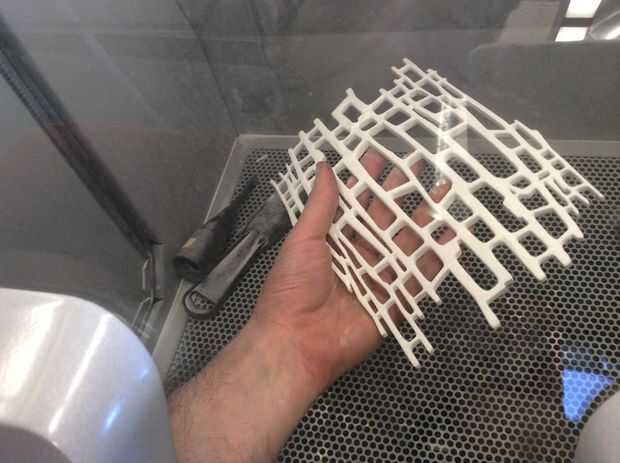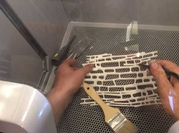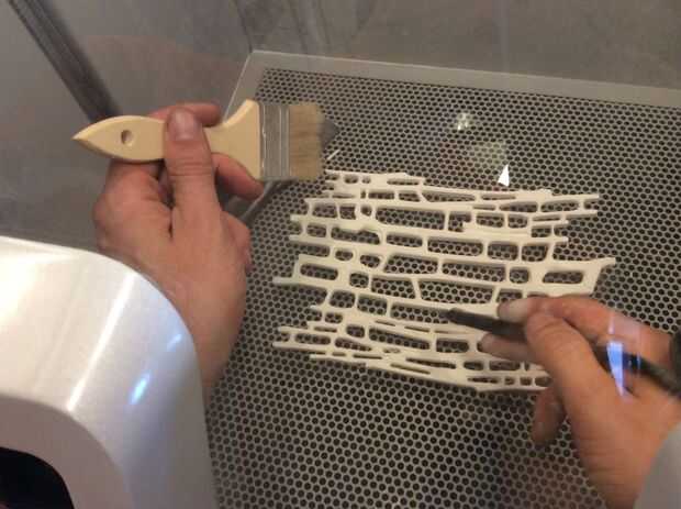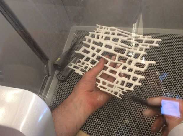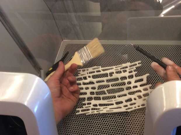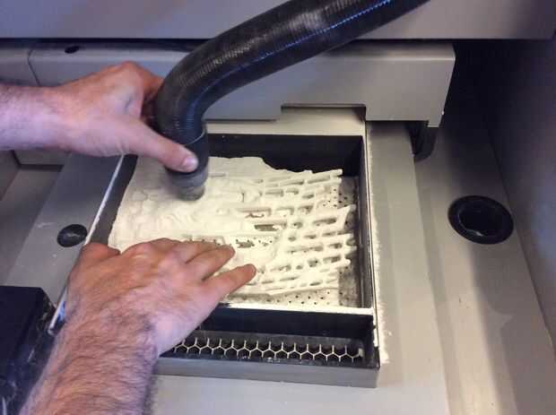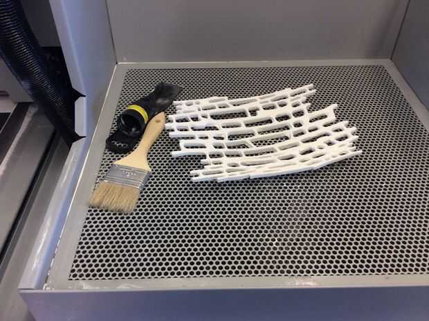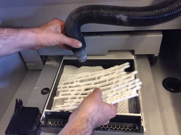 Introducir la máquina en modo de depowdering, tendrá un segundo para calentar y usted oirá el compresor de aire encender. Utilice la manguera de aire en el lado derecho de la máquina para quitar cualquier polvo residual de su parte. En orden para el tratamiento de cualquier post que puede hacer para trabajar, debe quitarse todo el polvo suelto. Asegúrese de voltear la pieza y utiliza la pistola de aire por todos lados. Cuando se ha eliminado el polvo colocó la parte de la base de acoplamiento y apague la depowdering. Espere a que el polvo resolver a continuación, abrir las puertas y quitar su parte.