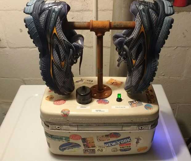 Este dispositivo se seque zapatillas soplando suavemente calentado el aire a través de ellos. El aire es bombeado en una caja de maquillaje vintage y calentado por una bombilla de 60 vatios. Entonces entra en un tubo de hierro bifurcado y es expulsado a través de los zapatos. Hay luces LED bajo mármoles de interés visual. Las tuberías envejecidas utilizando vinagre para grabarles seguido de un peróxido de hidrógeno y el baño de la sal.