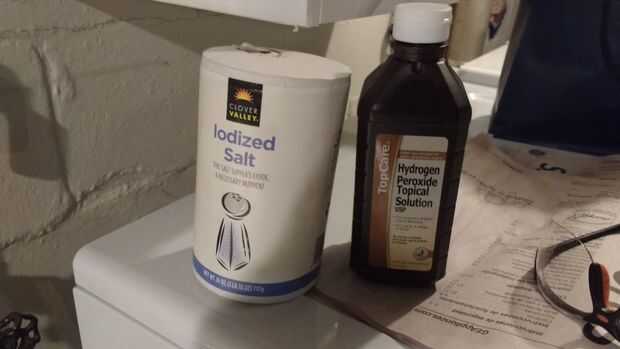 A continuación, mezclar una taza de peróxido de hidrógeno y 1/4 taza de sal con 1/4 taza de vinagre. Utilice un trapo o cepillo de espuma para cubrir los tubos. Repetir durante una hora. Colocar una caja de cartón o a manchar su superficie.