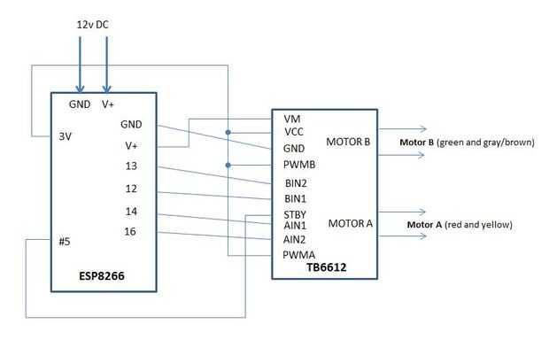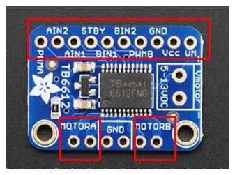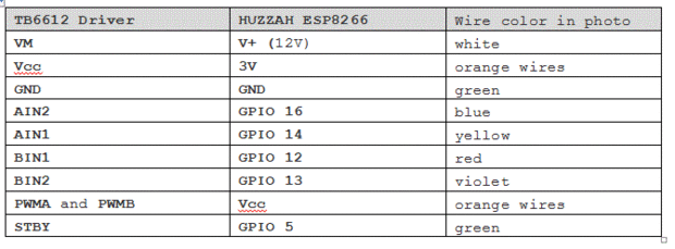 A continuación, conectar el tablero Huzzah ESP8266 a la Junta de TB6612 Driver (ver tabla de cableado y circuito de diagramas)