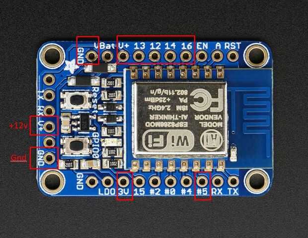 Conectar los 12v DC de alimentación a los pines GND y V + en el lado de la Junta de Huzzah (el mismo lado que el FTDI USB cable de programación conectada a en la carga de software, anteriormente.)