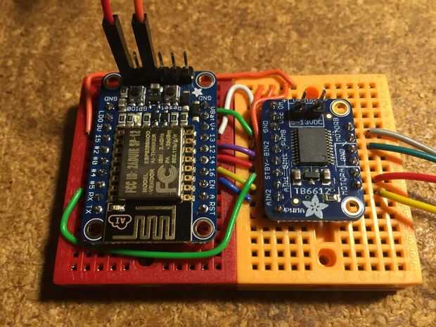 También, Steppers pueden conseguir muy calientes sin limitación de corriente. Puede utilizar una separado actual limitada fuente de alimentación 12v directamente sobre los cables de alimentación de Vmotor de TB6612. Si es así, entonces Desconecte el blanco cable entre VM y V + y conecte una fuente de 5v-16v a la ESP8266 HUZZAH. Asegúrese de dejar la tierra y 3v lleva todo en su lugar.
