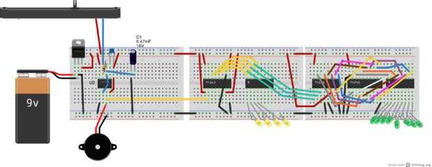 Conecte siempre la fuente de alimentación primero para asegurarse de que usted recuerde - en 74 IC que suele ser 5V para la parte superior izquierda pin (aquí #16) y la tierra para abajo a la derecha (aquí #8)