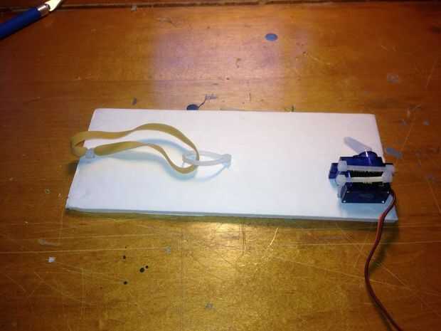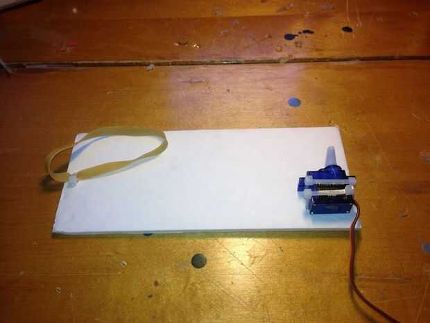 Ahora, usando una amarra, coloque la goma en el otro lado de la Junta - de la servo. Puede mover cerca o más dependiendo de qué objetos va a caer.