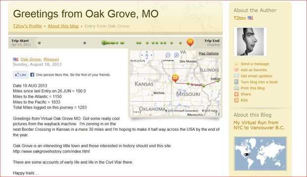 Usted puede elegir el intervalo pero encontré que registro cada 100 millas mantuvo el proyecto interesante sin que toma demasiado de mi tiempo.  Ir a Google Maps y puse en mi ubicación actual y luego ir probando diferentes ciudades hasta que uno de 100 millas de distancia.  Una vez que la ciudad lo volver a mi blog y entre como mi nueva ubicación.  Entonces voy a Wikipedia y Google para saber donde estoy y lo que ha sucedido allí.   Espero que lo mantenga hasta el Pacífico.  Cada vez que actualizo también las millas totales correr, millas en el Atlántico (desde Google Maps), millas del Pacífico y millas a mi siguiente paso fronterizo.