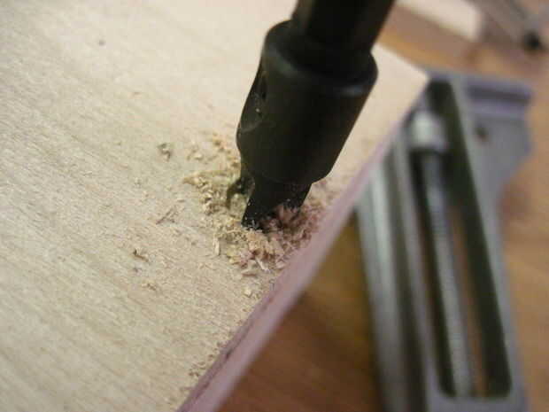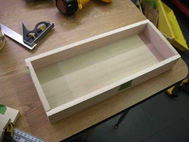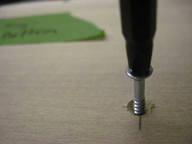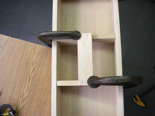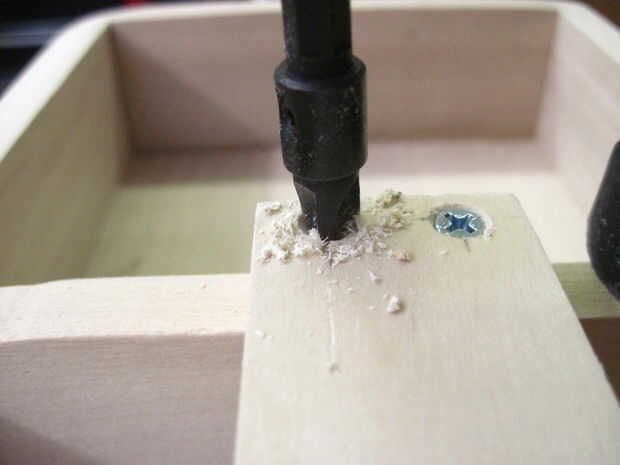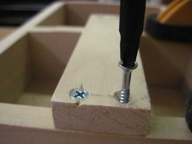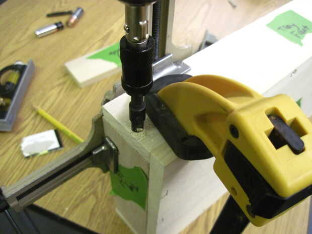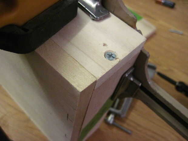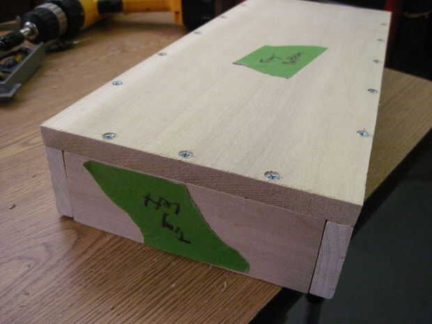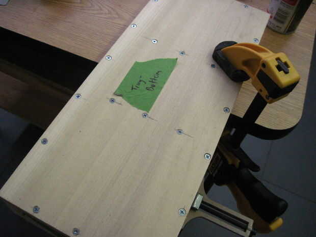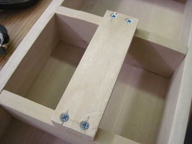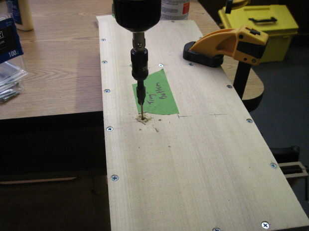 Sigan asi, casi se hace construir la caja. Todo lo que tienes que hacer es poner en la manija de la bandeja. En la parte superior de la manija, hacer 4 marcas que son 3/8" de los lados y 1/4" de los bordes. Toma un poco de esfuerzo, pero como se puede ver en las fotos de arriba, solo tienes que alinear las abrazaderas tipo c para obtener el identificador perfectamente una vez que se pega. Perfore los agujeros que están en diagonales uno del otro y poner tornillos en. Ahora usted puede quitar las pinzas, perfore los agujeros otra diagonal y poner tornillos en ellos. Una vez haya completado este paso, se hacen construir la caja! Deje que el pegamento seque durante un par de horas, y luego podemos pasar al siguiente paso.