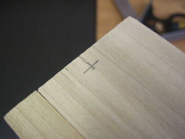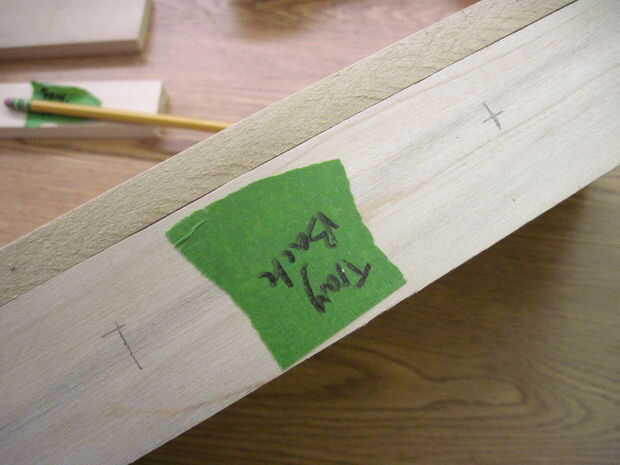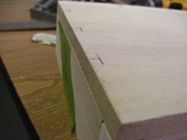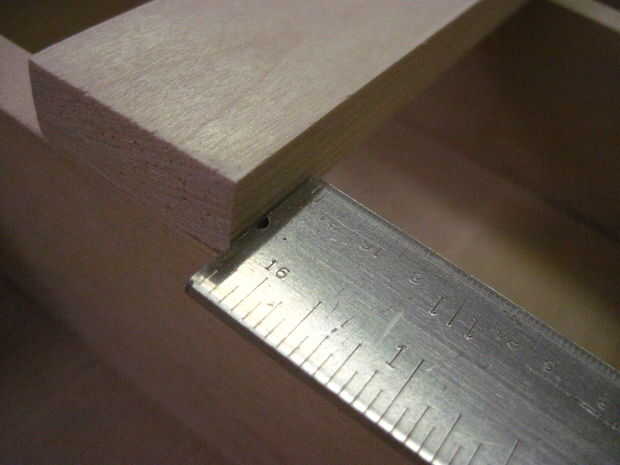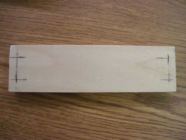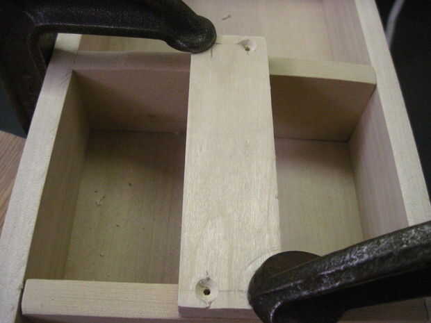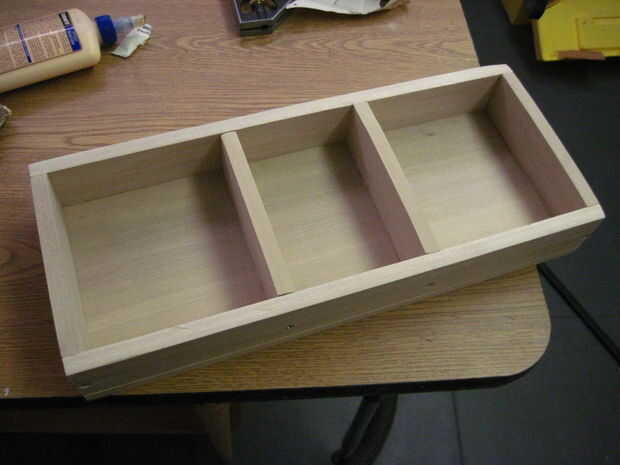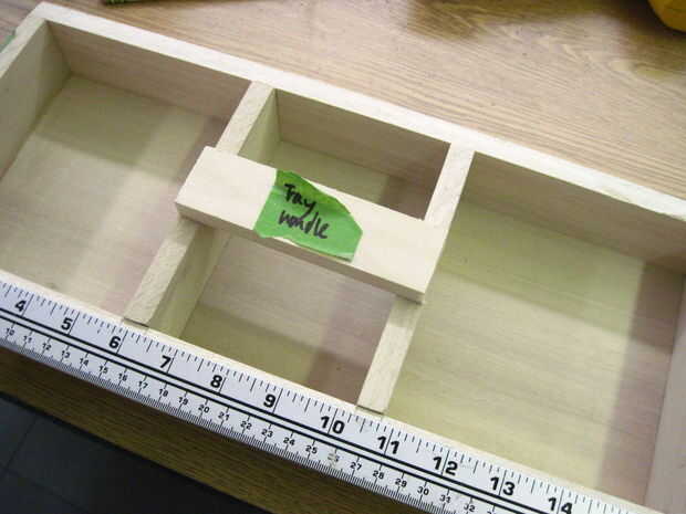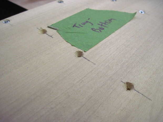 Una de las partes más difíciles de este proyecto es armar el resto de la bandeja. Vamos a comenzar con la parte inferior con 3 agujeros que están 1-1/4" aparte a partir de 1/4" en un lado y 1/4" en el otro lado de la marca. También, hacer marcas que son 6-1/8" en cada lado, que son también 1-1/4" aparte en la parte inferior. También, hacer marcas demostrando donde las piezas de separación irá en la parte superior, en 5-7/8 y 6-3/8" de cada esquina hacia adentro, dejando 1/2" para los divisores para sentarse (total 8 marcas). Finalmente, hacer 8 marcas total en la parte delantera de la bandeja y volver hacia el interior 1/4" y 6-1/8" hacia el interior de cada borde, 1-1/8" de la parte superior o inferior. Sé que esto suena muy complejo, pero si echa un vistazo a las fotos de arriba debe tener más sentido.