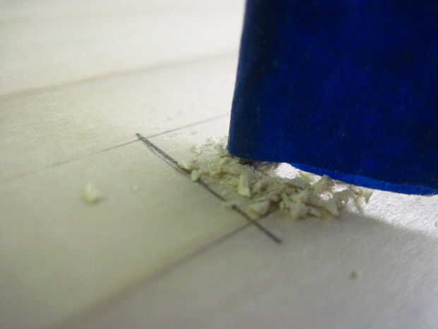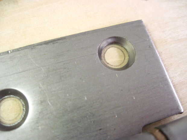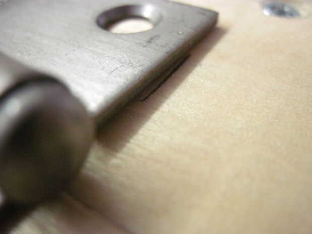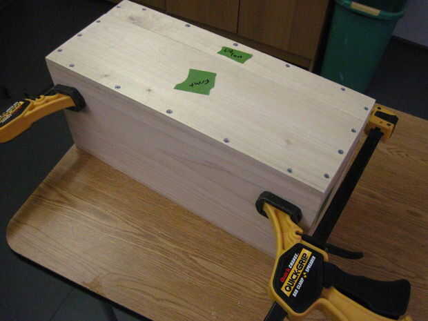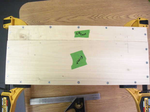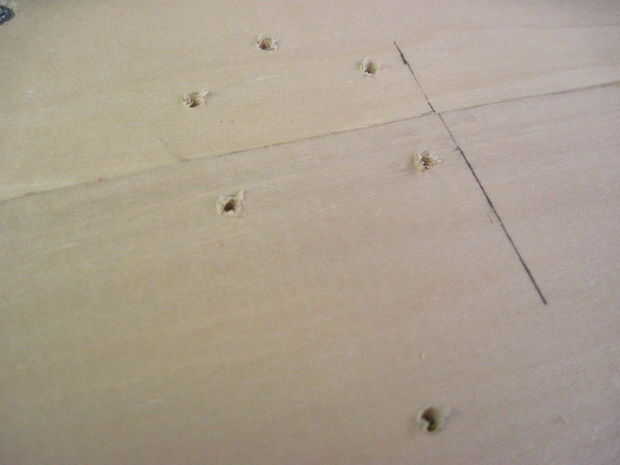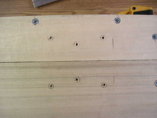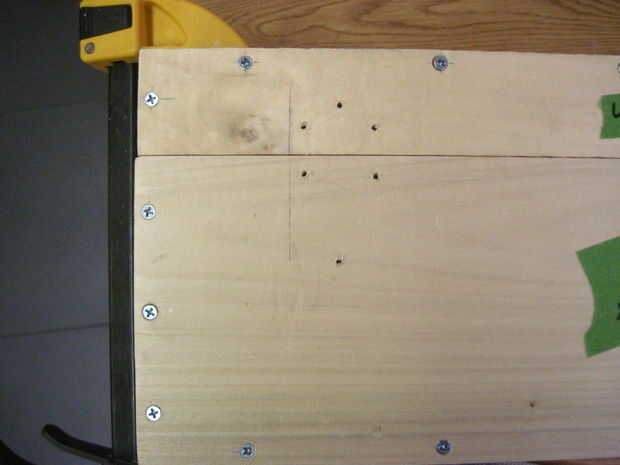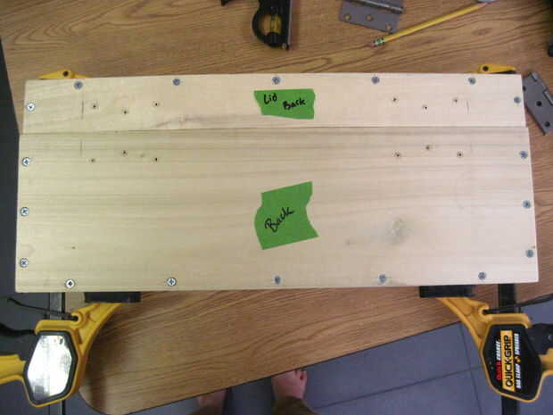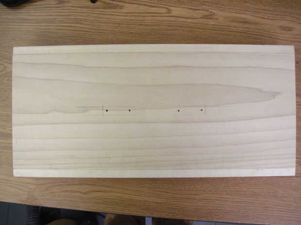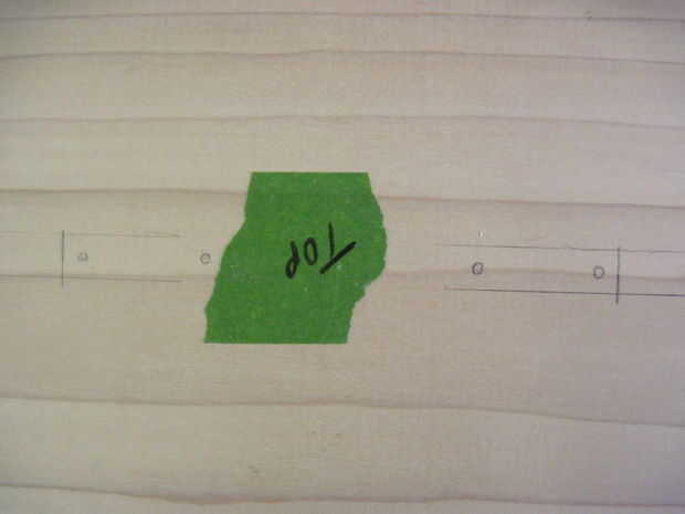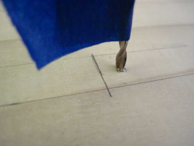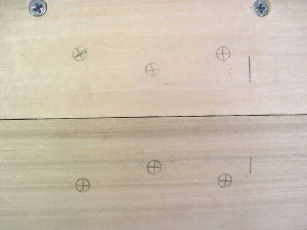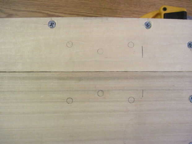 Ahora voltea la caja para hacer las bisagras-que deben ser 2-1/4" de los lados y alineación perfectamente en la división entre la parte superior e inferior. Las bisagras deben ser alineadas o no se abre la caja de. Una vez que se alinean, dibujar círculos en los orificios de montaje (otra vez), sino también marcas sorteo X dentro de los círculos para marcar donde irá la broca. Taladrar los 12 orificios x marca este tiempo, pero la parada en la cinta. Ahora termine con las marcas-las esquinas no necesita agujeros perforados.