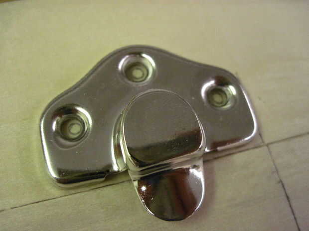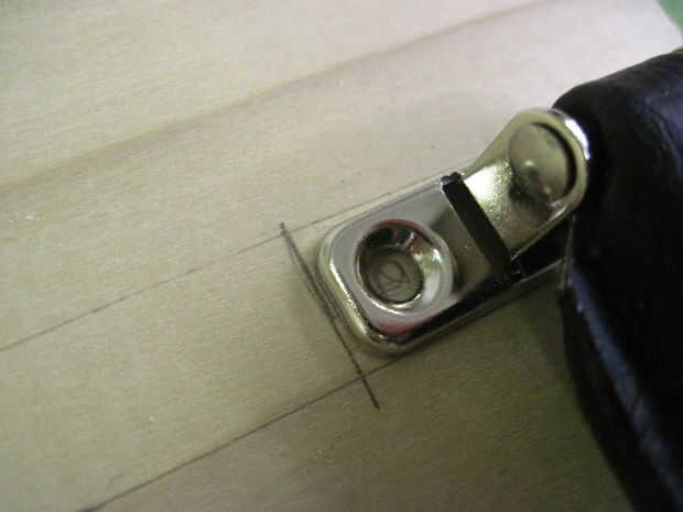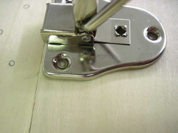 Sujete la parte superior y la base de la caja para hacer los broches y poner la caja en su parte posterior. Medir 2-3/4" en de los lados de la parte superior e inferior en la parte delantera y dibuje líneas allí a gravamen por el cerrojo superior e inferior. Organizar un poco lejos de la línea donde se unen la parte superior y la base de la caja de herramientas. Mantener estas piezas en su lugar y dibujar círculos dentro de lo agujeros de montaje del tornillo. Retire las piezas del cerrojo y perfore los agujeros de 12 3/8" de profundidad.