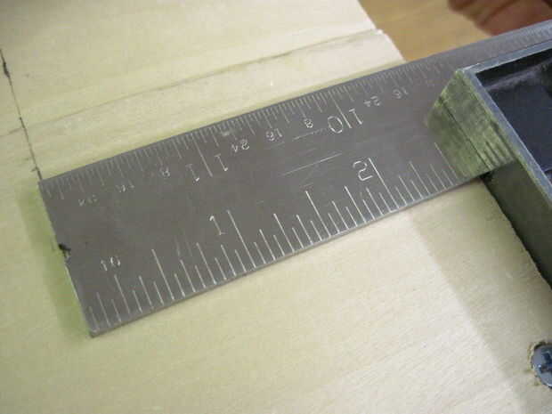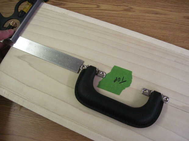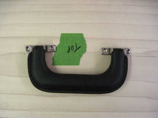 Vamos a empezar con el mango superior primero. Es de 6" de los lados de la parte superior y sobre 4" por delante y por detrás. Asegúrese de que se centra mediante la alineación de la escuadra de combinación para ser sólo la longitud correcta para que el mango se encuentra en el mismo lugar si utiliza esa longitud a cada lado. Una vez que el mango está en la posición correcta, utilice un lápiz suavemente dibujar círculos dentro de los orificios. Quite la manija y usar el taladro para hacer un agujero en los círculos que hiciste, pero parar en la cinta en el pedacito.