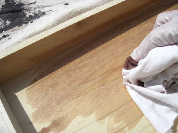Una vez que la primera capa de mancha se sienta seca al tacto, es necesario lijar la caja de herramientas completa ligeramente con papel de lija de grano 200. Limpie el polvo de madera con un trapo húmedo. Ahora, completa la segunda capa en exactamente la misma forma que el primero. Se verá la madera oscurecen como aplicar la mancha más, que es lo que debe suceder. Usted podría notar que la veta es más oscura que la superficie de la madera, sino es una condición normal y no es nada para preocuparse. Una vez más, que la madera seca y lo de la arena.