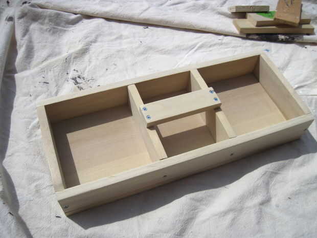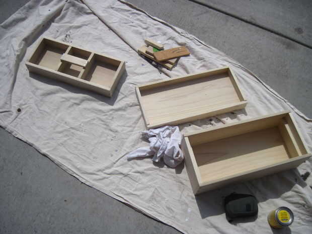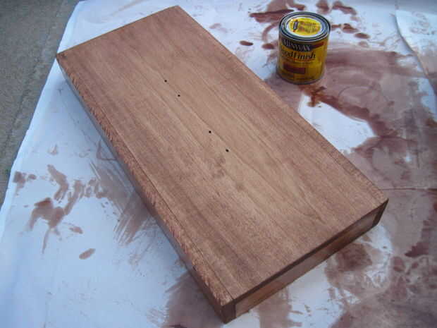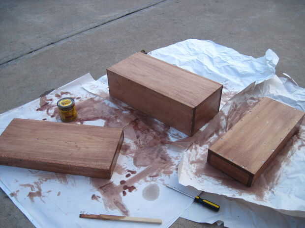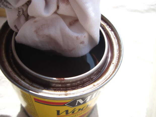 La coloración es uno de los pasos más difíciles en este Instructable, pero es indulgente, aunque lleva un tiempo. En primer lugar, usted necesitará limpiar hacia fuera la caja de herramientas completa con un paño húmedo para recoger las partículas de aserrín. Luego, poner en los guantes de nitrilo o látex. Usted no quiere conseguir manchas en las manos. Poner la lata de la mancha, la caja de herramientas, un trapo, un martillo y un flathead destornillador fuera o a un área bien ventilada. Tinta base aceite contiene hidrocarburos alphatic, que causan lesiones permanentes en cerebro y sistema nervioso si se inhala. No se olvide de trabajar en un área bien ventilada mientras se hace este paso y el siguiente. También, máscaras de polvo N95 no proporcionará protección contra manchas o vapores de poliuretano.