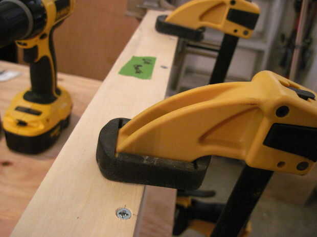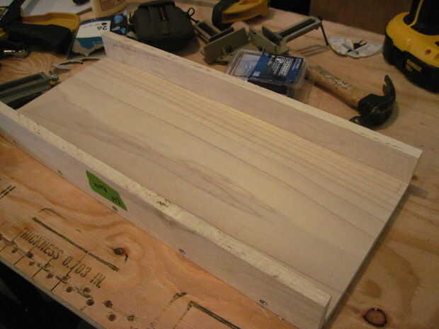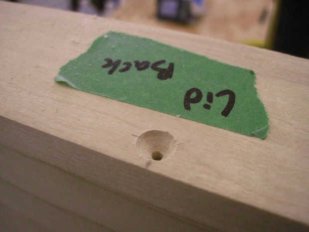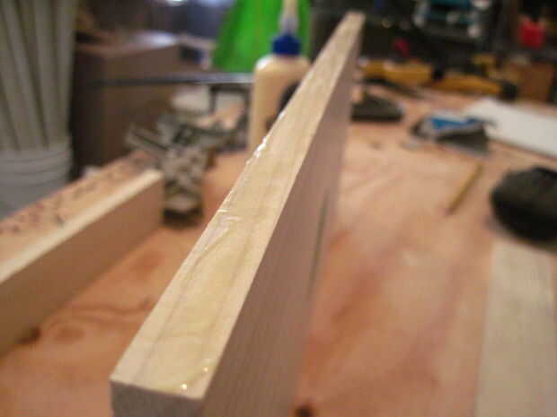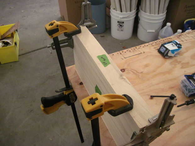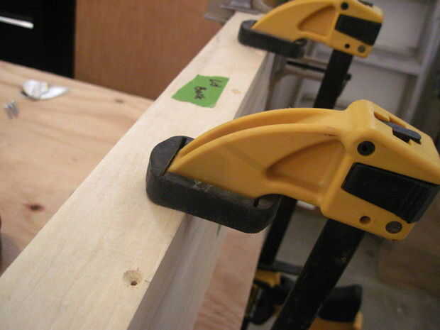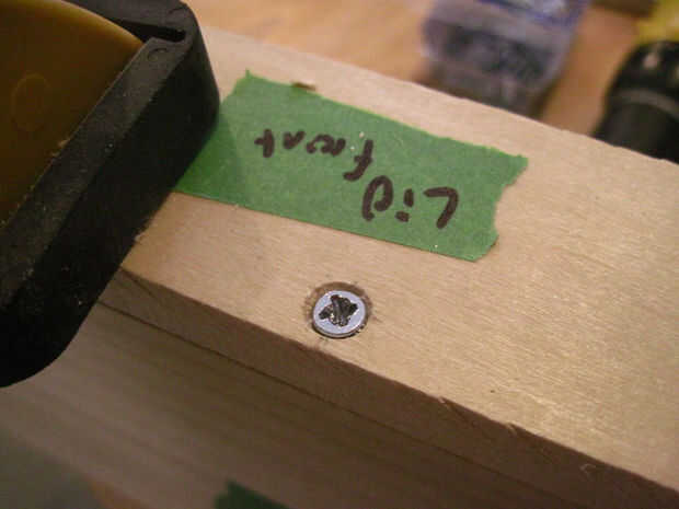 El conjunto superior es muy similar a la Asamblea del fondo, pero las piezas delanteras y traseros son más pequeñas. Para adjuntar el frente y atrás, pintar sobre pegamento en uno de los lados largos de la pieza superior y utilizar las abrazaderas de esquina para colocar la parte delantera o trasera una vez que ha marcado dónde perforar.