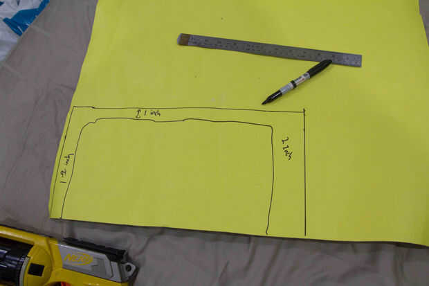 Medir el ancho de la pistola, que era alrededor de 2 pulgadas para mí. Dibujar hacia fuera antes de dibujar hacia fuera la otra mitad de su blaster.