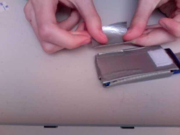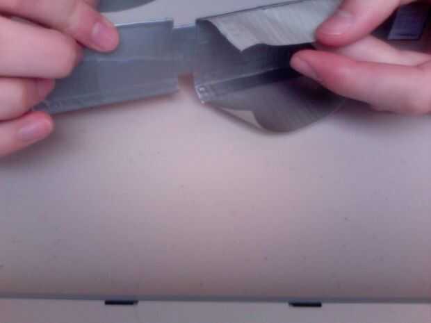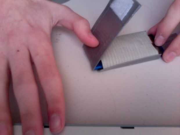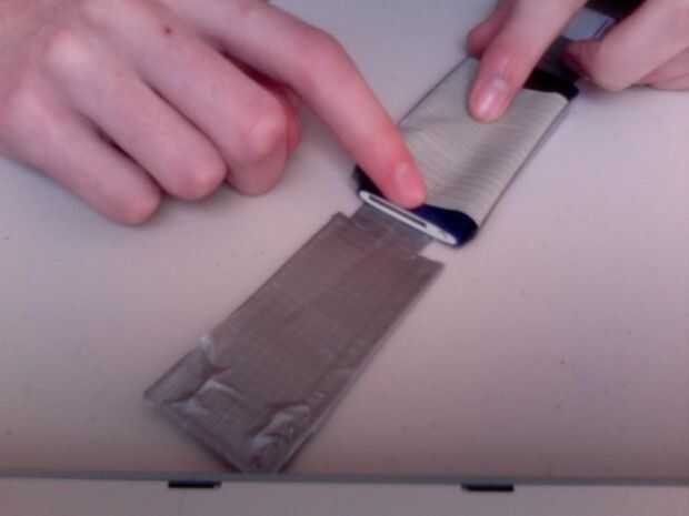 Now to close it up. En primer lugar dos tiras de cinta de la misma longitud (tal vez un poco más pequeño) como las aletas laterales. Luego pegar uno en cada aleta lateral, lado pegajoso hacia afuera. Poner el dispositivo en el lugar que será cuando termine el caso (cuadro 2). Doblar las aletas de cinta que usted acaba de poner en que están cubriendo el dispositivo y las aletas laterales son pie cubriendo los lados de su dispositivo (imagen 3). Luego doble la tapa frontal que adhiere a la nueva cinta y usar el dispositivo como una superficie plana para presionar, ya que es generalmente difícil conseguir sus dedos allí (Figura 4). Ahora la cinta sólo las aletas para el exterior de la caja, y listo.