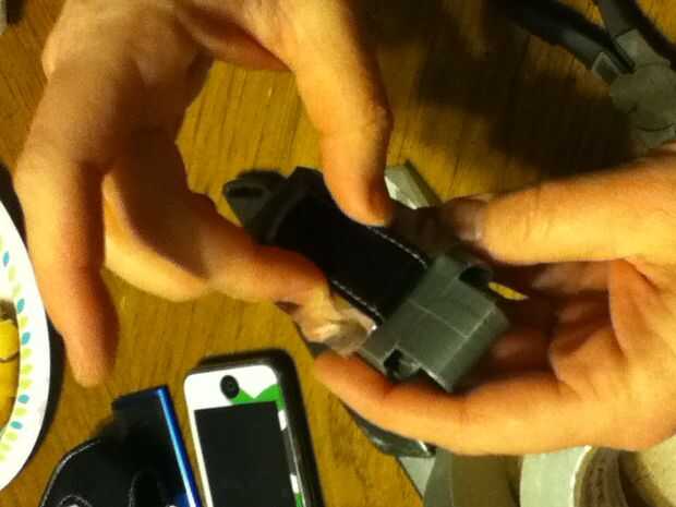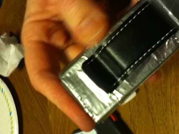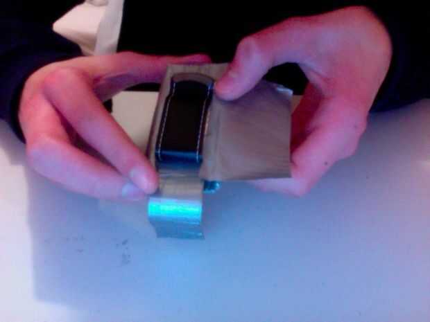 Now is the time for you to use the stronger tape. Os recomiendo cinta de aluminio para esto porque si usas cinta adhesiva normal te deslice lentamente apagado con el tiempo, especialmente si corres mucho (lo sé porque me pasó). Tome una tira de cinta de aluminio más larga que el ancho de su clip. Deslice la cinta de aluminio entre las puntas de la abrazadera con el lado pegajoso hacia en dirección a la parte más plana del reborde de la presilla. Ahora si quieres puedes poner algún adhesivo o pegamento caliente en la parte plana de la pinza. Pegar el clip en la sección central de la aleta trasera y presione la cinta. No dude en Añadir tanta cinta para reforzarla como usted quiere. Cuando hayas terminado, cubre la cinta adhesiva de aluminio plateado con cinta de conducto normal para que coincida con el resto de la caja.