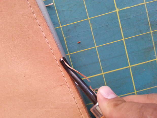 Usando una bordeadora de #2, se redondea las esquinas de la piel en los lados frontales y posterior del cuero.