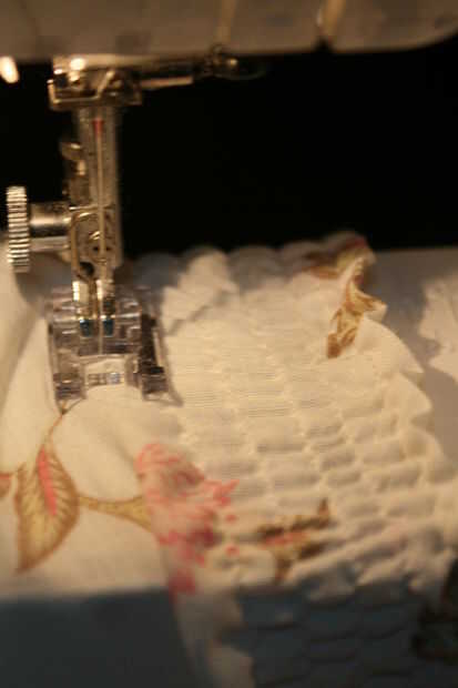 Ahora pasar el tejido por lo que es el dobladillo en el borde derecho del prensatelas. Esto es donde coser la siguiente línea de frunces. Si utiliza pie prensatelas su prensatelas como gage a donde sus puntadas deben ir, usted termina con frunces muy aseados y estrecho sin tener que medir cada línea.