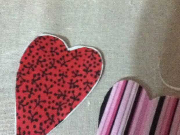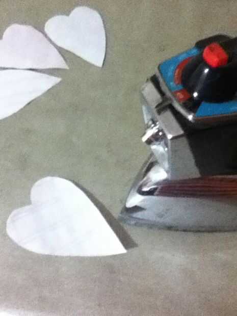 Lugar sus corazones con el lado derecho hacia abajo en la tabla de planchado y colocar los corazones de Bond números calor sobre ellas con el lado de papel hacia arriba siguiendo las instrucciones de planchado plancha les (Coloque la plancha a fuego medio en la parte superior del lado del papel durante 2 segundos, sin vapor)
