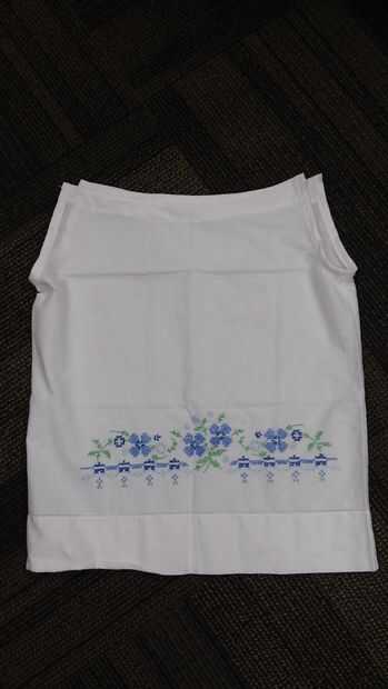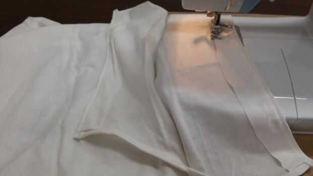 Utilizando lo que queda de la tela que corta la parte superior. Cortar un 3" mirando para el frente amplio y la espalda cubierta de escote, con el escote curvo sí mismo como el patrón. colocar derecho lados juntos y coser para delantera y posterior. Voltee hacia el interior, pespuntear en la parte superior del vestido. Gire en la parte inferior del frente a 1/4". PIN. Coser la parte inferior de la cara, frente y espalda. Deje los lados de la vista abierta para la cinta.
