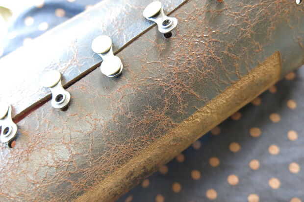 Tomar la cuerda de cuero y poner ambos extremos a través de dos de los agujeros en un lado de la parte superior de la vaina.