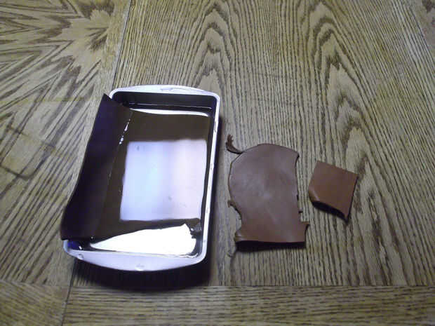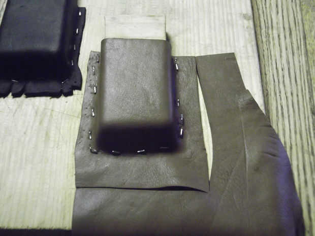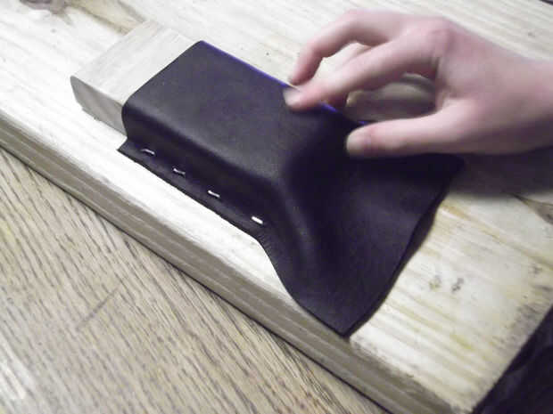 Ahora que tienes todas las piezas adecuadas, es necesario mojar la pieza frontal de la forma. Disfrutar de esta pieza en agua caliente y limpia para al menos 20 minutos. Una vez que su piel ha empapado, sujete cuidadosamente (o básico) el borde de una superficie plana, luego doblar y estirar el cuero pieza sobre el molde de madera hecho en el paso 3. Si se utiliza cuero curtido de verduras, necesita hacer varios cortes en forma de v en el borde inferior de la pieza de cuero en orden para las esquinas para formar correctamente (es posible que tenga a las Naciones Unidas-abrazadera cerca de la esquina por lo que puede estirar su piel donde necesita). Tenga cuidado de no cortar sus ranuras demasiado grande o usted tendrá que tratar con costura sobre ellos más adelante, y su producto final no sea tan buena. La obra curtida del aceite encontré que no necesitó hacer cualquier rajas en el cuero; Sólo formado alrededor del molde y grapado por (ver imagen).