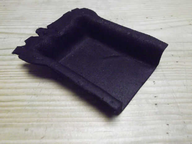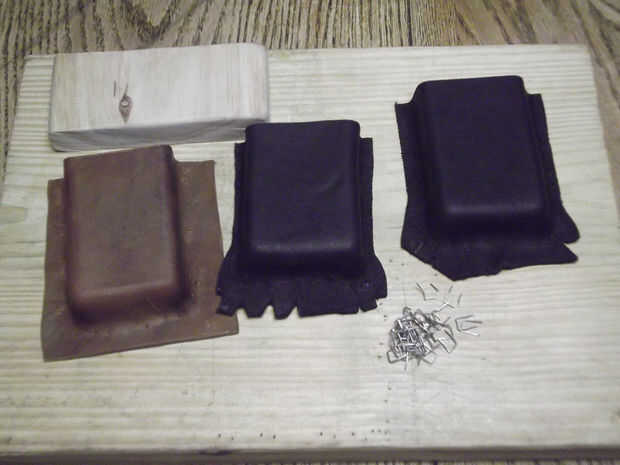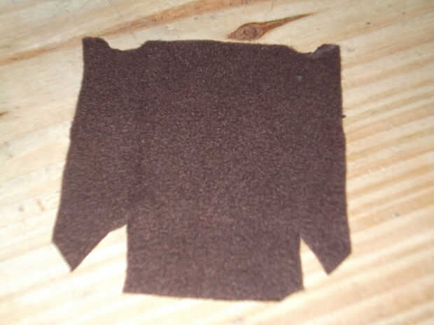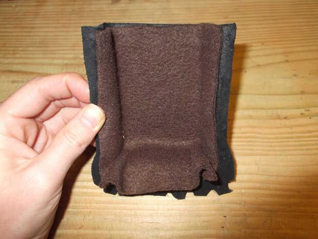 Una vez que haya secado la pieza de cuero moldeado Retire del molde e inspeccione. Luego marcar una hendidura semicircular en los lados de la pieza y utilizar un cuchillo de la manía para cortar las. Montar la pieza del frente polar en la pieza de cuero moldeado. Alíselo en la pieza moldeada para que el paño grueso y suave lo cubre sin problemas excepto pliegues adicionales en las esquinas. Corte piezas triangulares en las esquinas de la pieza de paño grueso y suave para conseguir deshacerse de los dobleces y corte ranuras semicirculares en la pieza de paño grueso y suave que coinciden con los de la pieza de cuero moldeado.