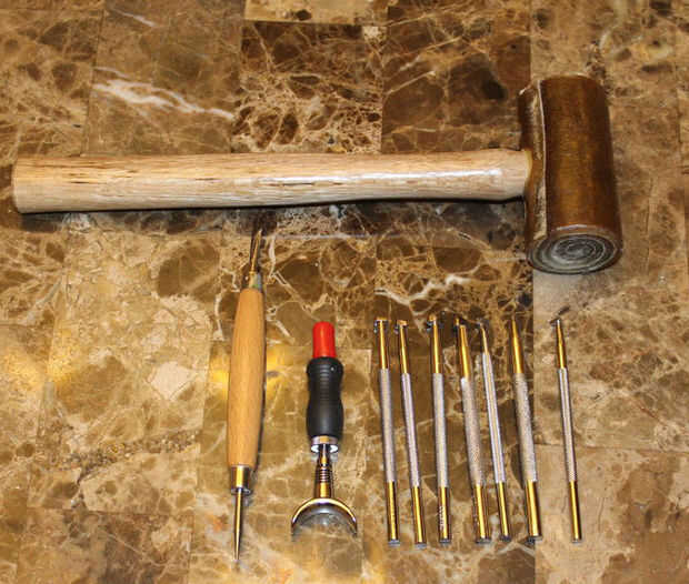 También considere qué diseño de herramientas se colocará en la parte frontal o si habrá alguna herramientas hecha. Patrones pueden hacerse también con los pernos prisioneros de cobre amarillo dándole un aspecto tradicional. Elijo la herramienta mi piel sobre todo como una oportunidad para un gran proyecto de la herramienta. He seguido el patrón de Tandy bastante cerca pero no le gustó el diseño original que estaba en la parte superior de las secciones transversales; por lo tanto, he creado el nudo cardo entrelazadas para reemplazarlo. Te voy a dar más detalles sobre patronaje en el paso siguiente.