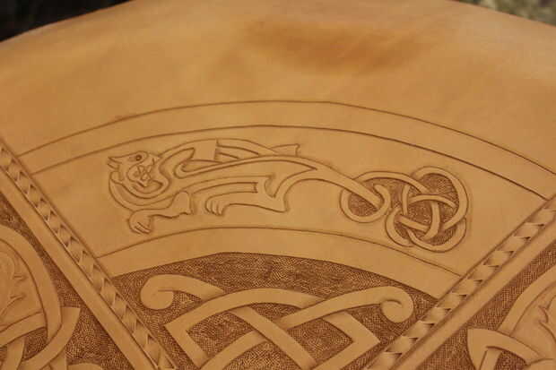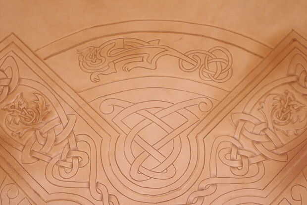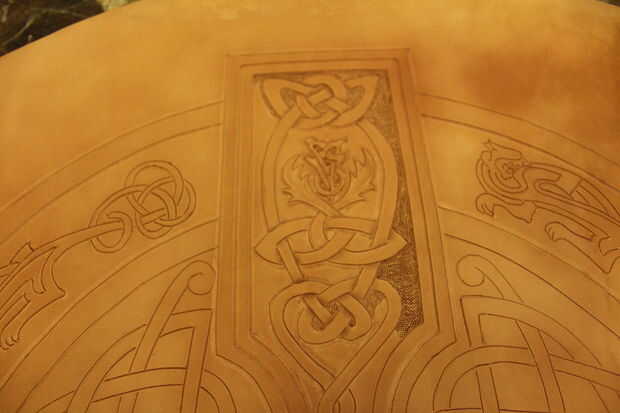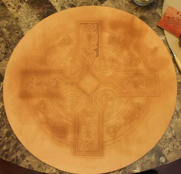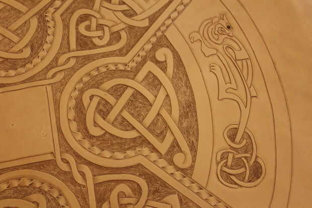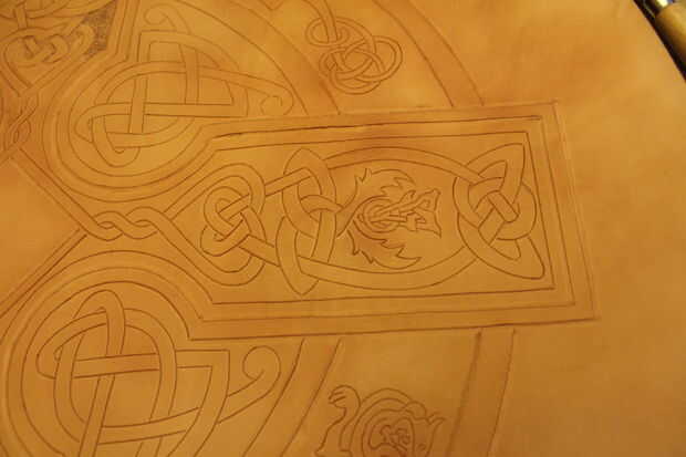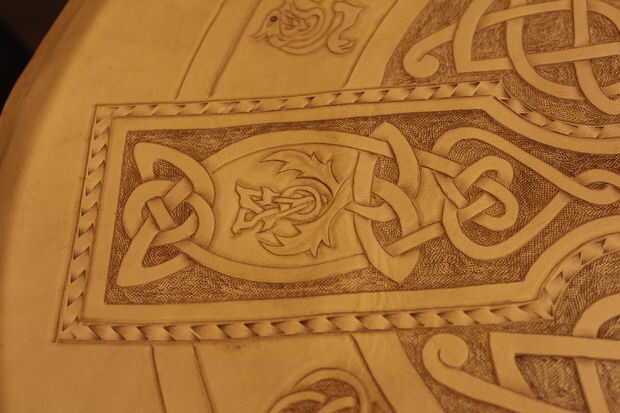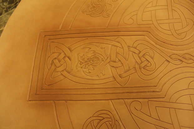 Una vez que se transfiere todo el patrón y está satisfecho con cómo se ve es la hora de conseguir los útiles. Utilice la cuchilla giratoria para cortar todas las líneas, después hacer el biselado. Generalmente desea biselar cualquier línea que no es para ver muy nítidas sobre todo líneas que Irán en el fondo. Entonces hacer cualquier vinculación con la cuchara de modelos si es necesario. Usé esto en las hojas del cardo para darles dimensión. Yo también engañado un poco con la cuchara para crear la mayor parte de mi restregar y sólo utiliza un biselador de textura en los cruces en los nudos. A continuación, poner en la tierra detrás y finalmente usar las estampillas especiales para poner en características de la textura como los sellos de línea o carta de cuerda. Hacer estos últimos por lo que fácilmente puedo ver donde van y luego limpiar a su alrededor después con la parte posterior adicional de puesta a tierra si es necesario. Este paso es probablemente el más desperdiciador de tiempo porque no quiere dejar que la piel seque hasta que se hace. Siempre puede agregar más agua después si es necesario pero como mucho con una cubierta que puedas es mejor. Creo que volver a mojar el cuero varias veces es por eso que mía se contrajo hasta un poco.