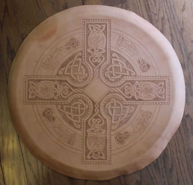 Aquí el primer paso es transferir el patrón a la piel. Terminé usando 9 pedazos de papel una vez impreso y grabado juntos. Por desgracia esto hará muy difícil conseguir una buena marca de tu lápiz táctil donde los bordes tienen dos capas de papel o más y la cinta. Yo también estaba preocupada de que el papel se rompería para arriba antes de obtener el patrón entero establecido, ya que este es un proyecto grande y la piel estará húmeda. Hay varias opciones para evitar el uso de papel normal. Tandy vende una película de trazo más grueso y más durable que el papel. Es bastante barato en 3 dólares a yarda y probablemente sólo necesita una yarda. Sin embargo, encontré una alternativa más fácilmente disponible y más barata. Hay vinilo transparente que se vende todo, tengo la mía en Wal-Mart, para cubrir muebles cuando se mueve o en almacenamiento. Está totalmente claro lo que es muy fácil ver lo que está haciendo y es lo suficientemente espesa para ser durable pero suficientemente delgada como para dejar una marca limpia sobre la piel. Vino en un rollo que era 30" altura y vendido por la yarda por $1.50. Una yarda era abundante y su reutilizable Si utilizas un mojado borrar marcador y no dejarse llevar con presión en la aguja.