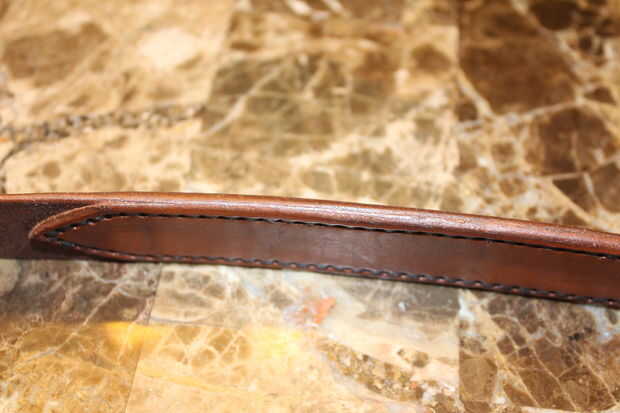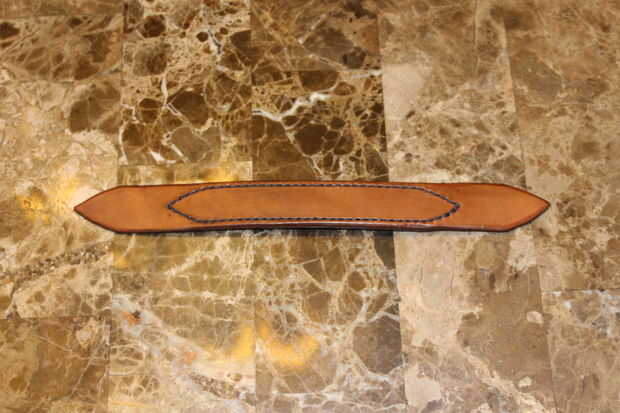 A continuación hacer el mismo procedimiento para la correa de muñeca. Sin embargo, aquí el ancho sólo debe ser aproximadamente una pulgada a una pulgada y media. También asegúrese de que hay un montón de espacio para el dedo pulgar pasar a través cuando la correa está abajo o a tener un tiempo difícil subir y bajar. También se utiliza una correa adicional el mismo ancho pero no siempre la línea de la parte posterior de esta correa. Esto hace mucho más cómodo para usar contra la muñeca y añade fuerza a la correa, así. Esta correa es la única costura que puede ser necesaria a menos que usted está usando hebillas o espejadas tochos como yo lo hice. Después de teñir cemento la debajo de la correa en la parte superior y coser en así. No repasar los pasos de costura porque es bastante recta hacia adelante, pero aquí es un gran video que es muy detallado. (Cuidado con el video es 1,5 horas pero bien vale la pena verla, examen completo de hilo, agujas, hacer agujeros y coser con un montón de ejemplos)