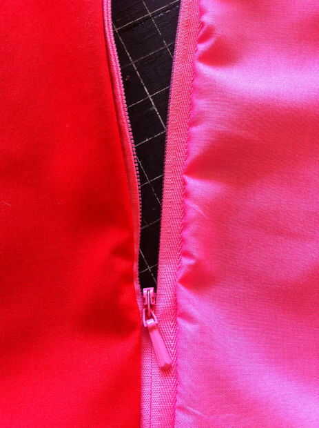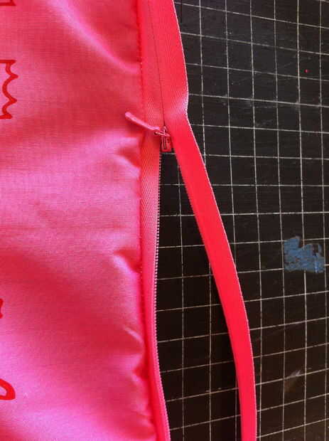 Ejecutar a través de la máquina de coser, teniendo cuidado de quitar los pasadores como ir a lo largo - para asegurarse de que no rompa la máquina, ni los pernos (si no está seguro de que puede controlar la velocidad de la máquina de coser puede utilizar cinta adhesiva para mantener la cremallera en lugar en lugar de pines).
